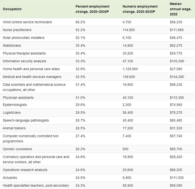 Here are the fastest growing jobs from 2020 to 2030, along with the number of jobs that will be created and the median pay for the position.