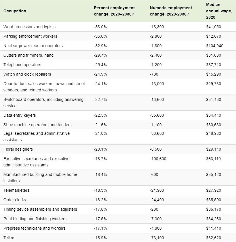 Structural changes in the economy will cause some jobs to decline quite quickly. Here are the top 20 jobs where employment is expected to decline the fastest over the next decade.
